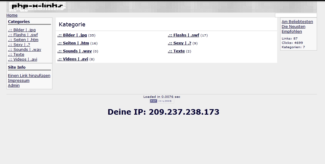 …alles wurde anders und plötzlich sehr aufregend, als ich Ende 2003 mein erstes PHP Skript zum laufen bekommen hatte. PHP-X-Links war ein sehr rudimentäres aber nettes Linkdumpskript mit Hitcount und später auch eingebauter Ratingunterstützung. Ca. 2005 wurde das Skript vom Entwickler nicht mehr weiterentwickelt, da sich der Autor anderen Interessen widmete. Dennoch gibt es auch heute noch Seiten, welche eine der PHP-X-Links Versionen nutzen. In relativ kurzer Zeit bekam die Seite einen ungeahnten Trafficzuwachs, der natürlich stark motivierte.