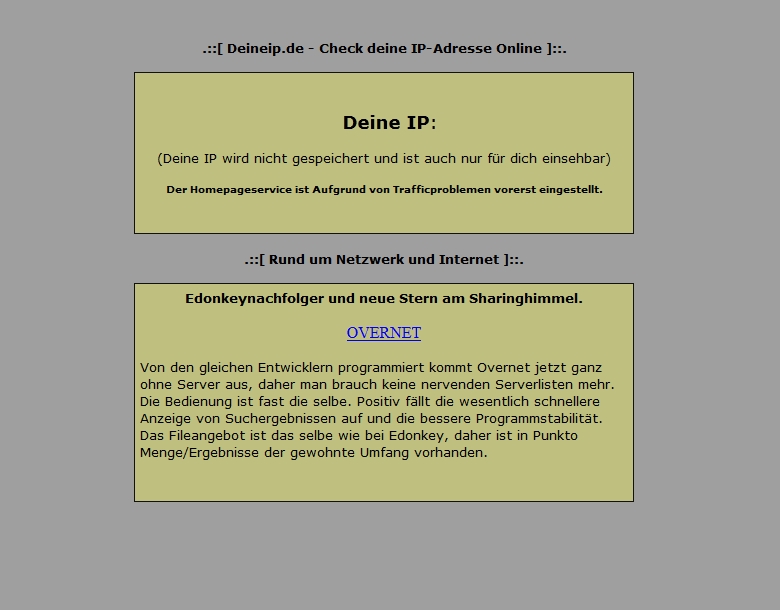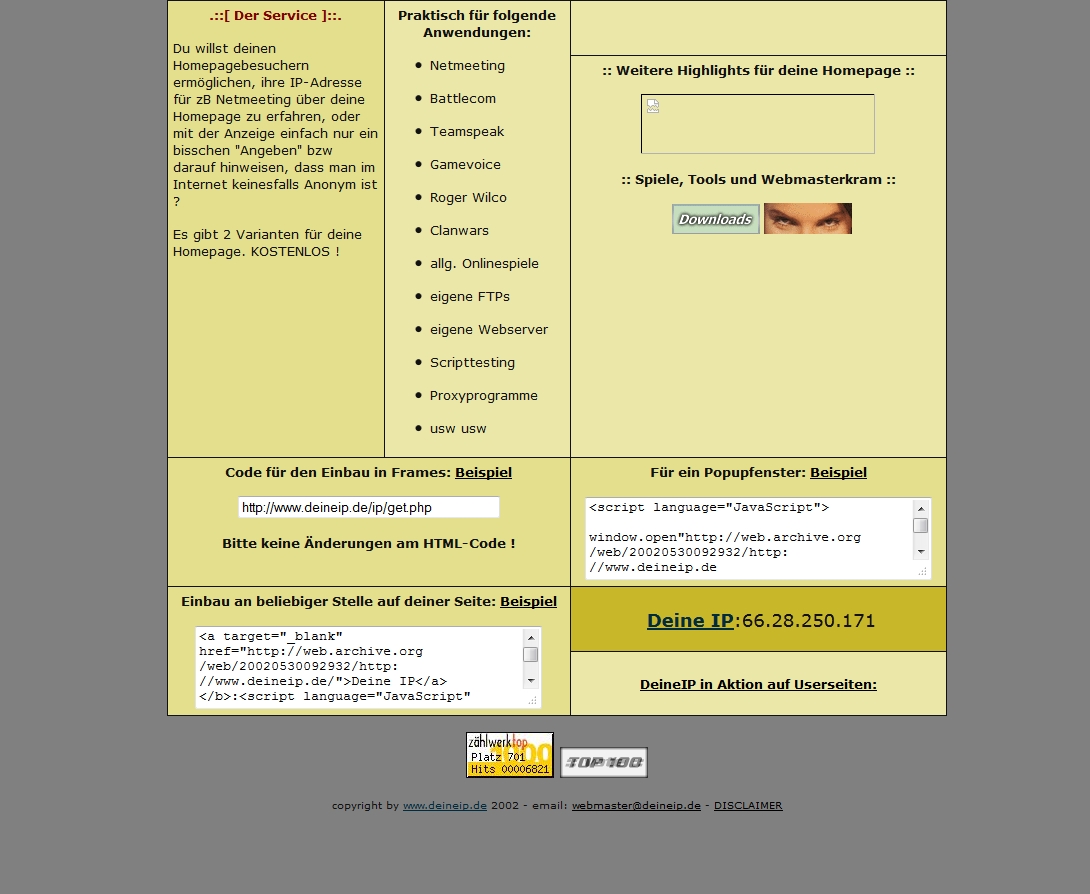 Am Anfang konnte man sich seine Ip-Adresse anzeigen lassen und die Seite bestand aus einer reinen HTML-Tabelle. Deineip.de sollte ein Service sein, der von anderen Webmastern via HTML/JavaScript-Code eingebunden werden konnte. Damals gab es noch etliche Anwendungen wie Netmeeting, Battlecom oder Gamevoice die eine manuelle IP-Adresseingabe benötigten.