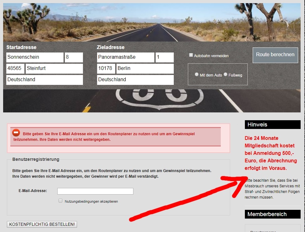 Der Nutzer soll hier zunächst einen Account anlegen und verpflichtet sich dabei eine 24 Monate dauernde Mitgliedschaft für 500€ abzuschließen. Die Joomla-Baukasten-Seite sieht auf den ersten Blick schon mal ziemlich zusammengebastelt aus und ich wundere mich immer wieder wer auf die Idee kommt dort seine Route zu planen.