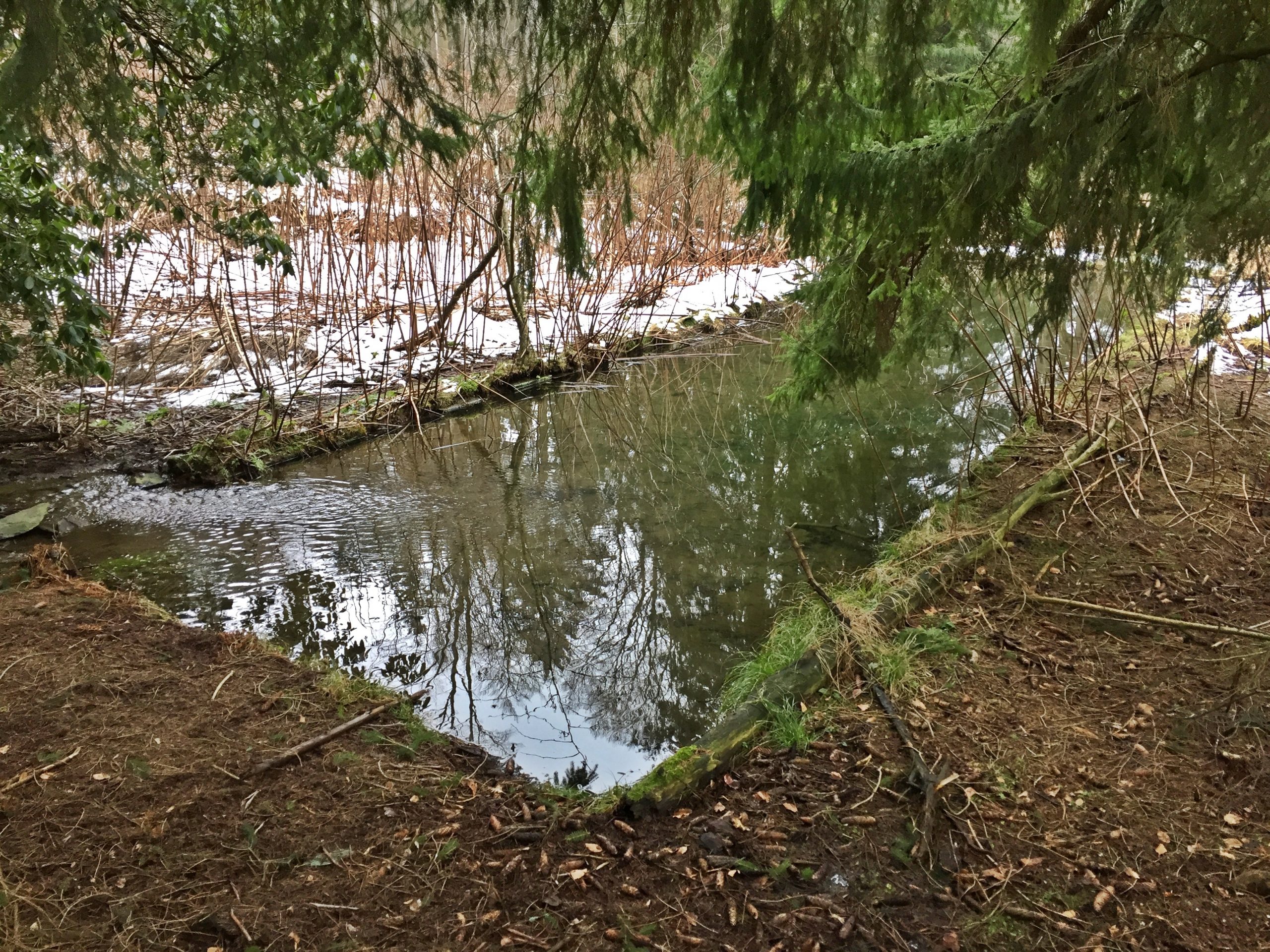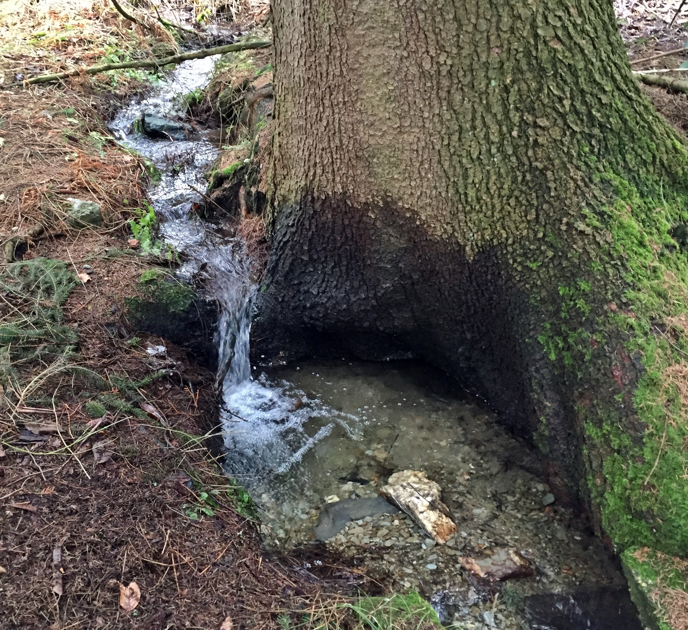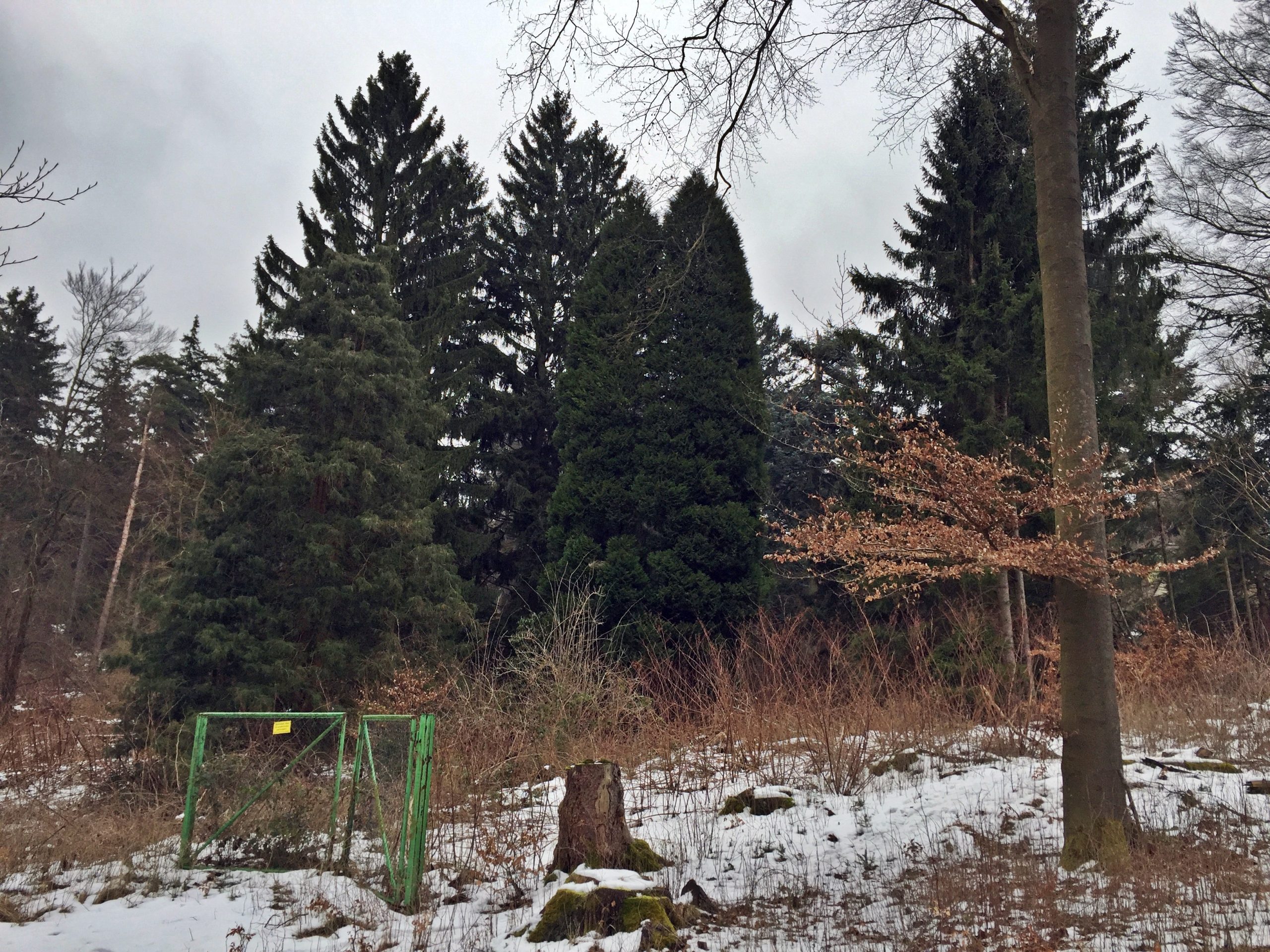 Das ganze Areal ist mit teilweise exotischen Nadelbäumen bepflanzt. Heute haben diese eine stattliche Höhe erreicht. Ein imposante Felsen wurde oben mit einem Laufgitter gesichert, welches teilweise noch vorhanden ist. So konnte man auf einem angelegten Weg vom Haus aus auf den Felsen spazieren. Etwas versteckt unter den Bäumen finden sich auf die Reste des alten Swimmingpools. Ein kleiner, natürlicher Bachlauf speist den Pool mit frischem Wasser. Vermutlich war das Becken einmal tiefer, mittlerweile ist natürlich einiges an Sand und Schlamm drin.