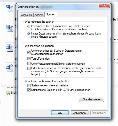 Hier lassen sich die gewünschten Optionen festlegen und nach einem Klick auf OK durchsucht die Windows-Datei-Suche auch die Inhalte aller nicht-indexierten Dateien. Je nach Umfang kann das allerdings eine Weile dauern.