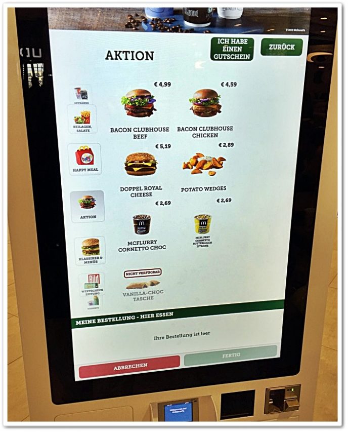 Damit sollen die Wartezeiten verkürzt werden und die Produkte frischer sein, da punktgenauer auf den Bedarf zubereitet. Das ganze klappte auch recht gut wobei ich die EC-Karten Lösung erfolgreich ausprobiert habe.