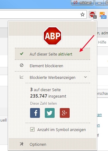 2. “Auf dieser Seite aktiviert” anklicken um eine Ausnahme für die aktuelle Seite hinzuzufügen: