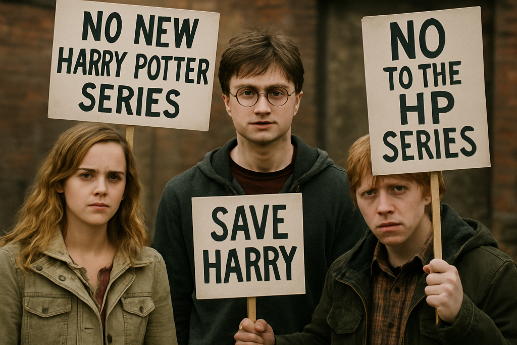 Harry Potter, Hermine und Ron protestieren gegen die neue Harry Potter Serie