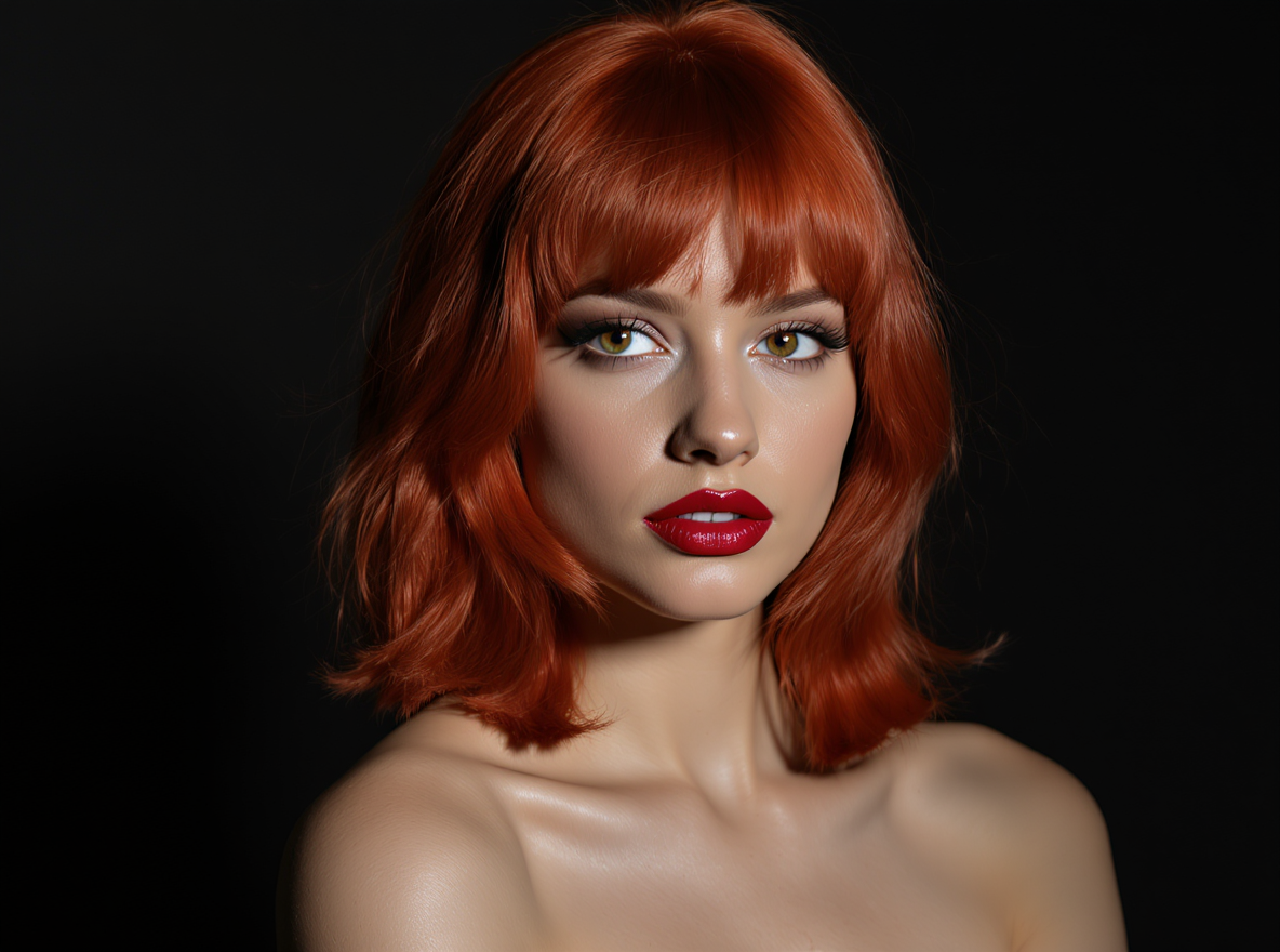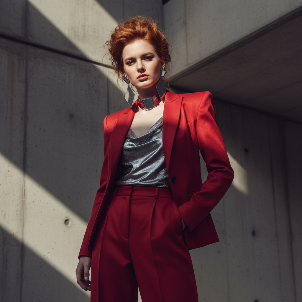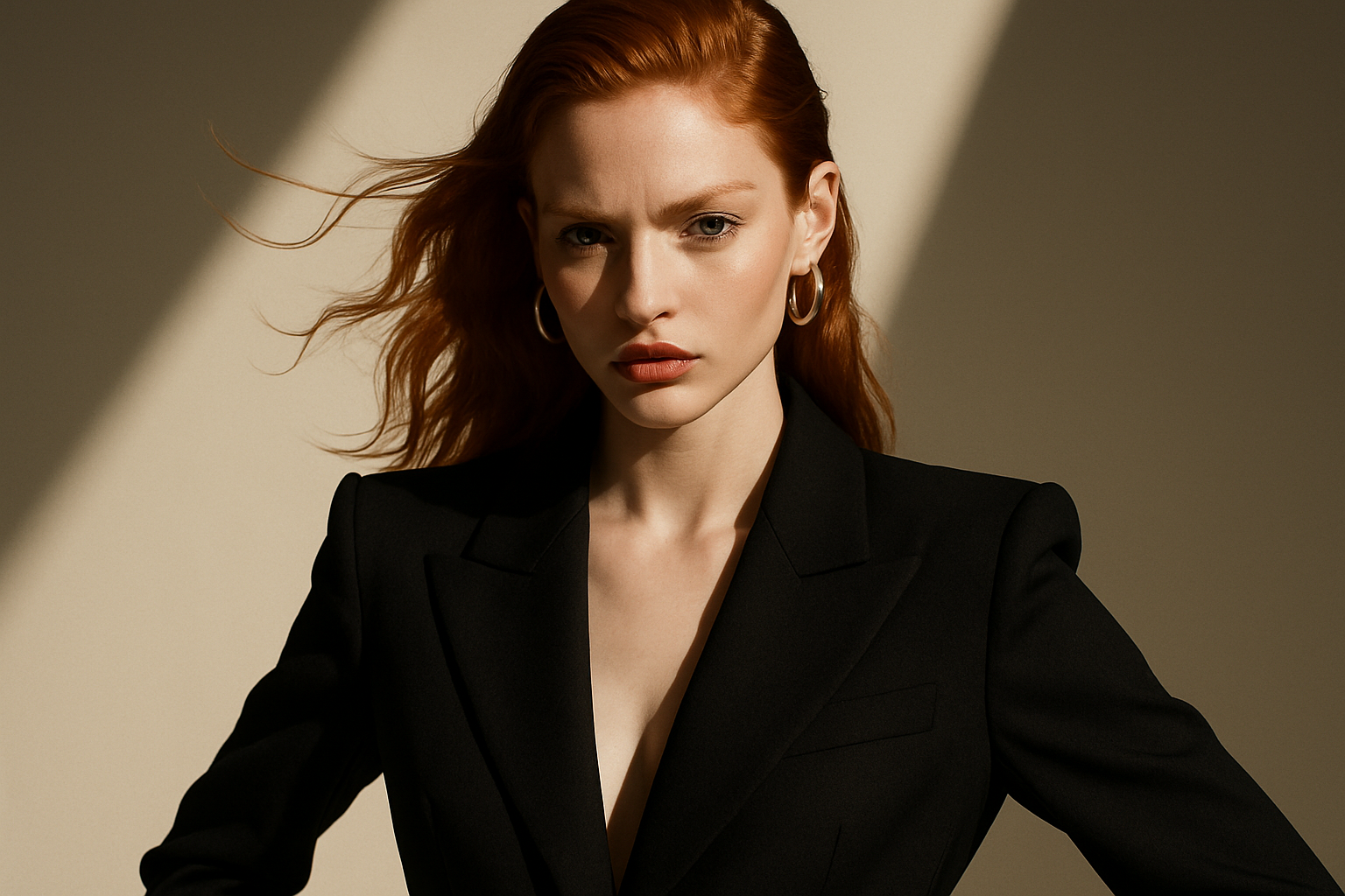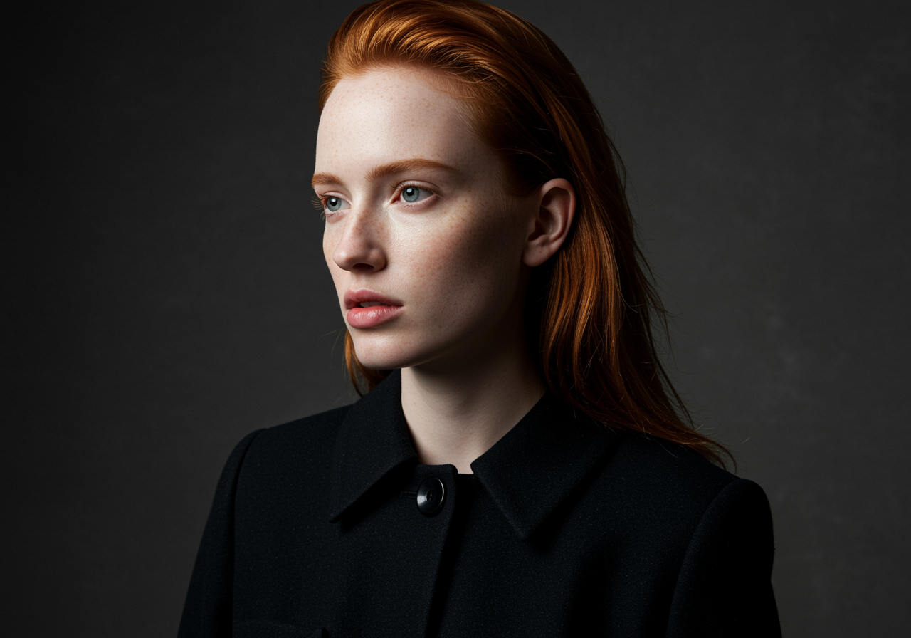 Redaktionelle Modefotografie einer jungen rothaarigen Frau, cit , beleuchtet von Hardkey-Lichtern, die ein Multi-Flash-Setup simulieren, definierte Kanten und tiefe Schatten erzeugen, scharfer Fokus, selbstbewusster Ausdruck, High-Fashion-Ästhetik, ultra-detailliert