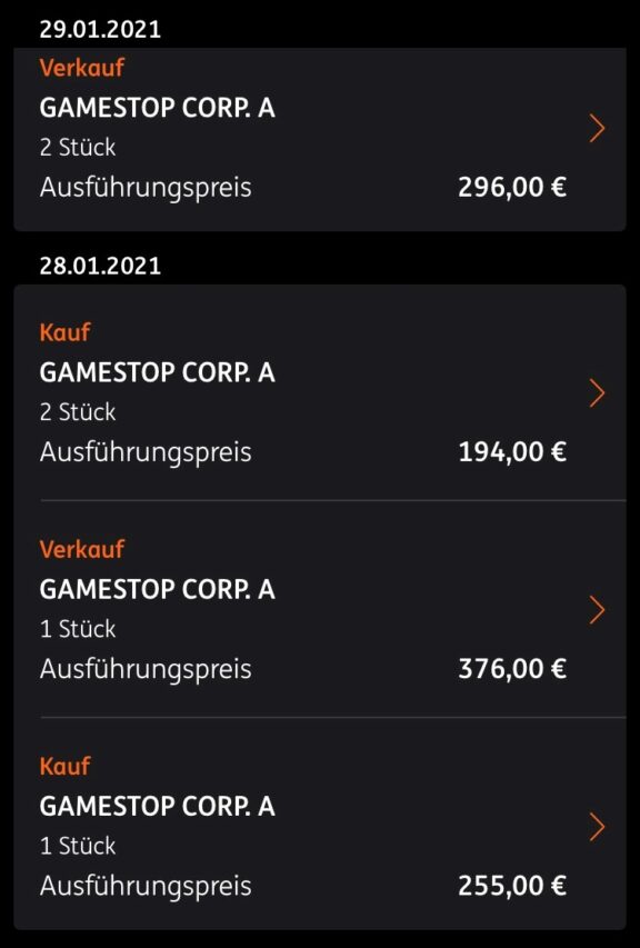 Letze Woche bin ich auf den Zug der GameStop Aktie aufgesprungen und habe mir zunächst 1 Aktie für 255 € gekauft :-) Am selben Tag bin ich die dann für 376€ wieder losgeworden. Habe am späterern Nachmittag den Gewinn reinvestiert und 2 Stück für 194 € gekauft. Am 29.1 konnte ich dann wieder mit 102€ Gewinn verkaufen. War eine spannende Erfahrung und ich halte inzwischen noch weitere GameStop Aktien und warte auf den großen “Squeeze” ;-) Ob der kommt oder nicht werden wir sehen. Natürlich ist das ganze hochspekulativ aber die Story die sich um dieses Phänomen entwickelt hat finde ich überaus spannend und möchte darüber etwas berichten.