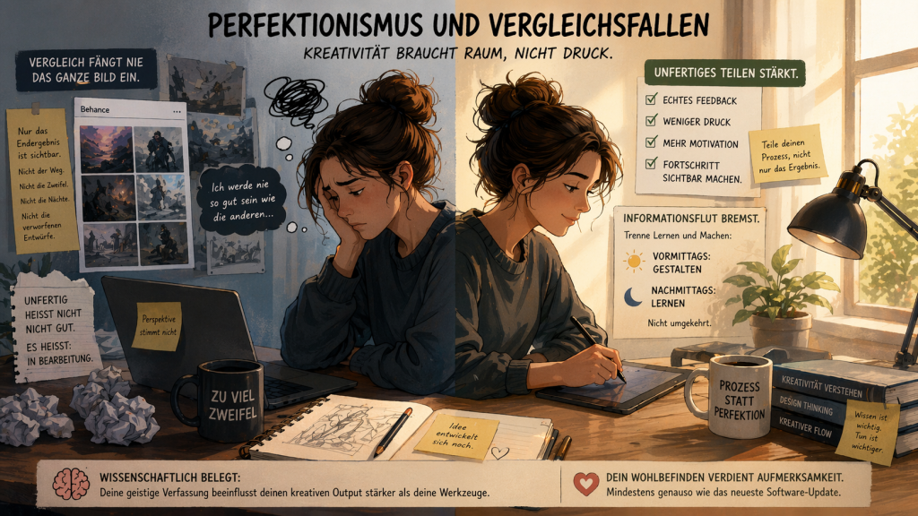 Auch die Informationsflut stellt ein ernstes Hindernis dar. Wer ständig Tutorials konsumiert, kommt selten zum eigentlichen Schaffen. Eine bewährte Gegenmaßnahme: Feste Zeitfenster für Lernen und Machen trennen. Vormittags wird gestaltet, nachmittags gelernt – nicht umgekehrt. Interessante wissenschaftliche Erkenntnisse zur Kreativitätsforschung zeigen, dass die geistige Verfassung den schöpferischen Output stärker beeinflusst als die verfügbaren Werkzeuge. Das eigene Wohlbefinden verdient deshalb mindestens genauso viel Aufmerksamkeit wie das neueste Software-Update.