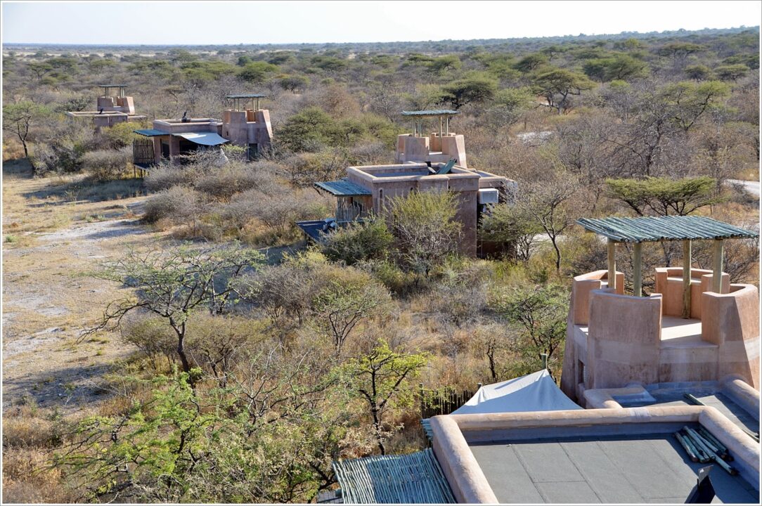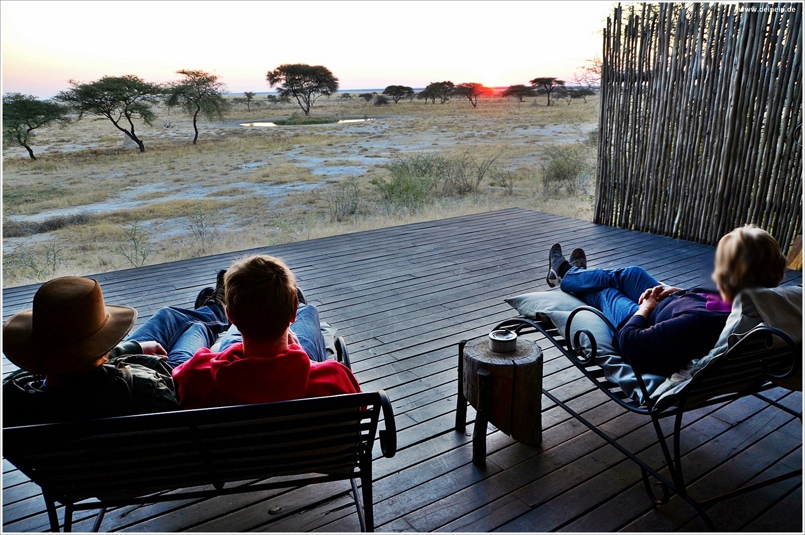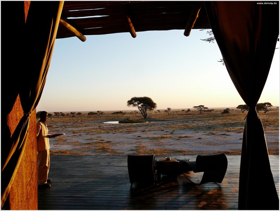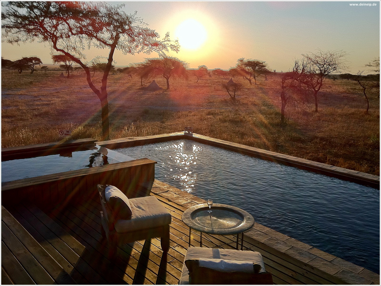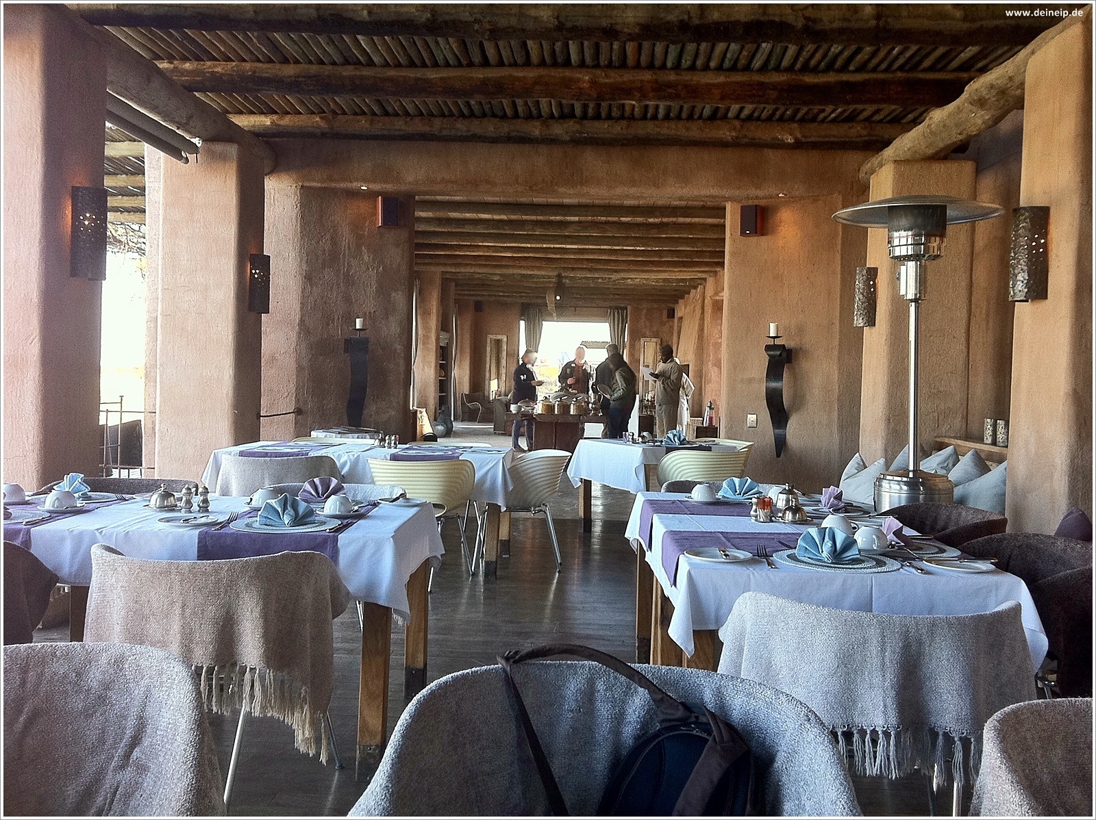 Der Stil ist irgendwie eine Mischung aus marokanischer Wüstenfestung und afrikanischem Buschcamp. Es dominieren grandiose Terrassen mit super Ausblick auf Wasserlöcher zur Wildtierbeobachtung. Die Zimmer mit eigenen Terrassen sind von der Ausstattung für die Region überragend und das Essen lässt auch kaum Wünsche offen. An heißen Tagen laden flache Pools dazu ein, einen Cocktail zu trinken und dabei die Füße im Wasser baumeln zu lassen. Der für Namibia typische Sonnenuntergang ist dabei natürlich inklusive!