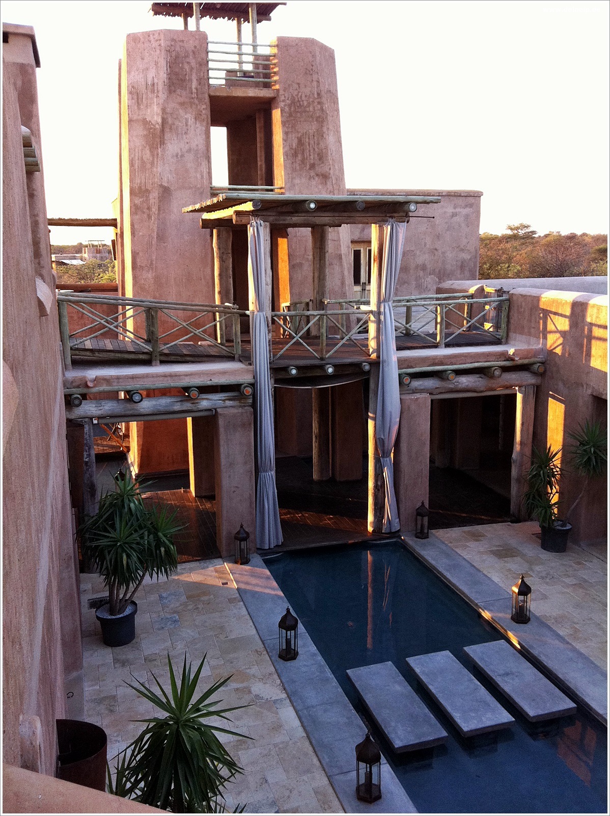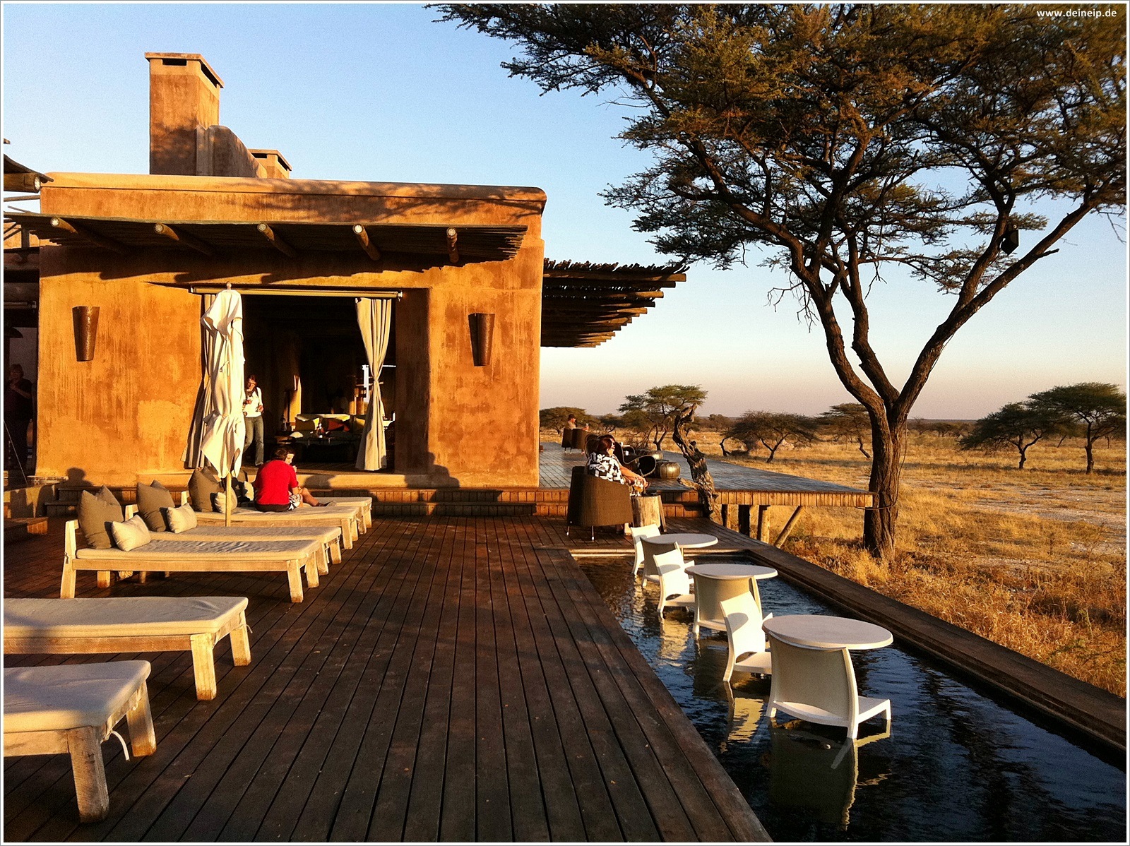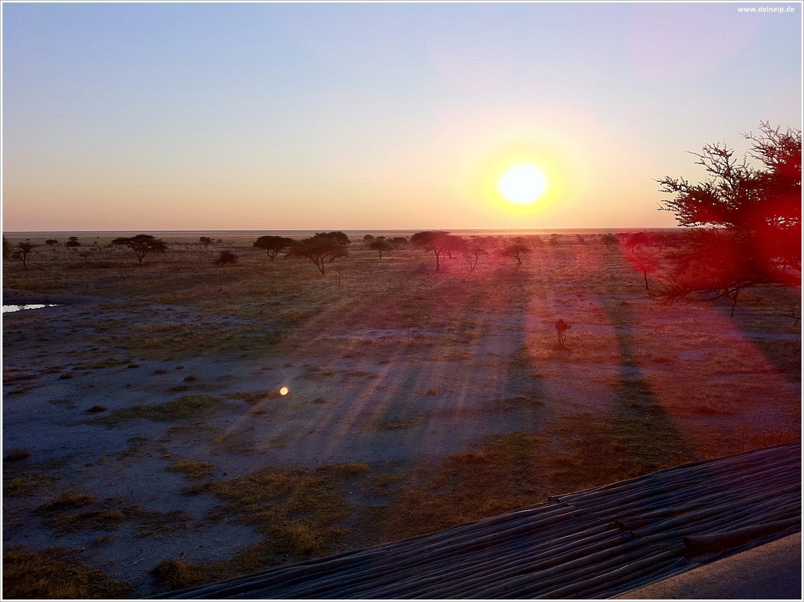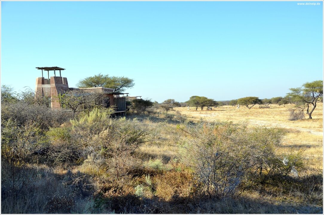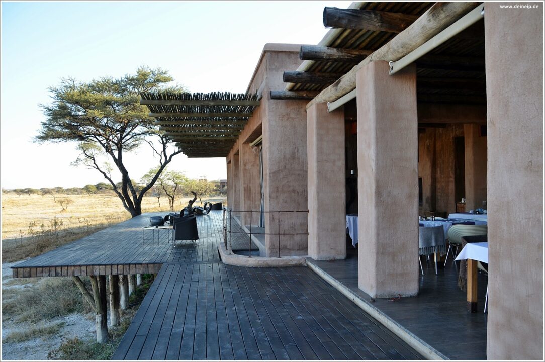 Der Stil ist irgendwie eine Mischung aus marokanischer Wüstenfestung und afrikanischem Buschcamp. Es dominieren grandiose Terrassen mit super Ausblick auf Wasserlöcher zur Wildtierbeobachtung. Die Zimmer mit eigenen Terrassen sind von der Ausstattung für die Region überragend und das Essen lässt auch kaum Wünsche offen. An heißen Tagen laden flache Pools dazu ein, einen Cocktail zu trinken und dabei die Füße im Wasser baumeln zu lassen. Der für Namibia typische Sonnenuntergang ist dabei natürlich inklusive!