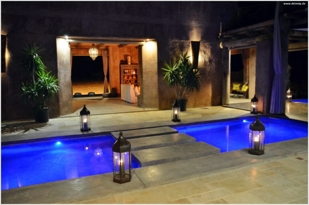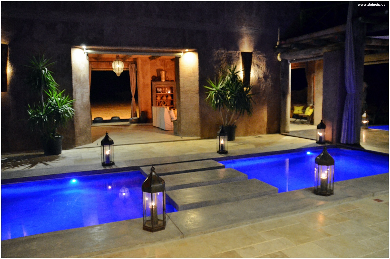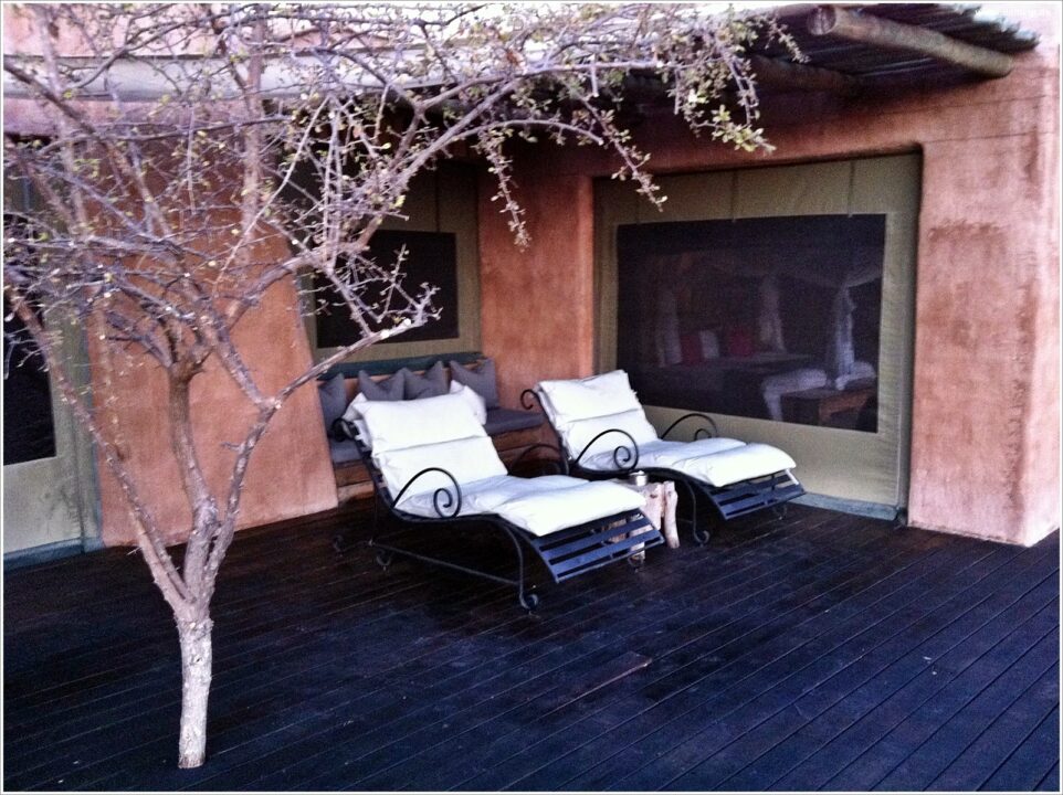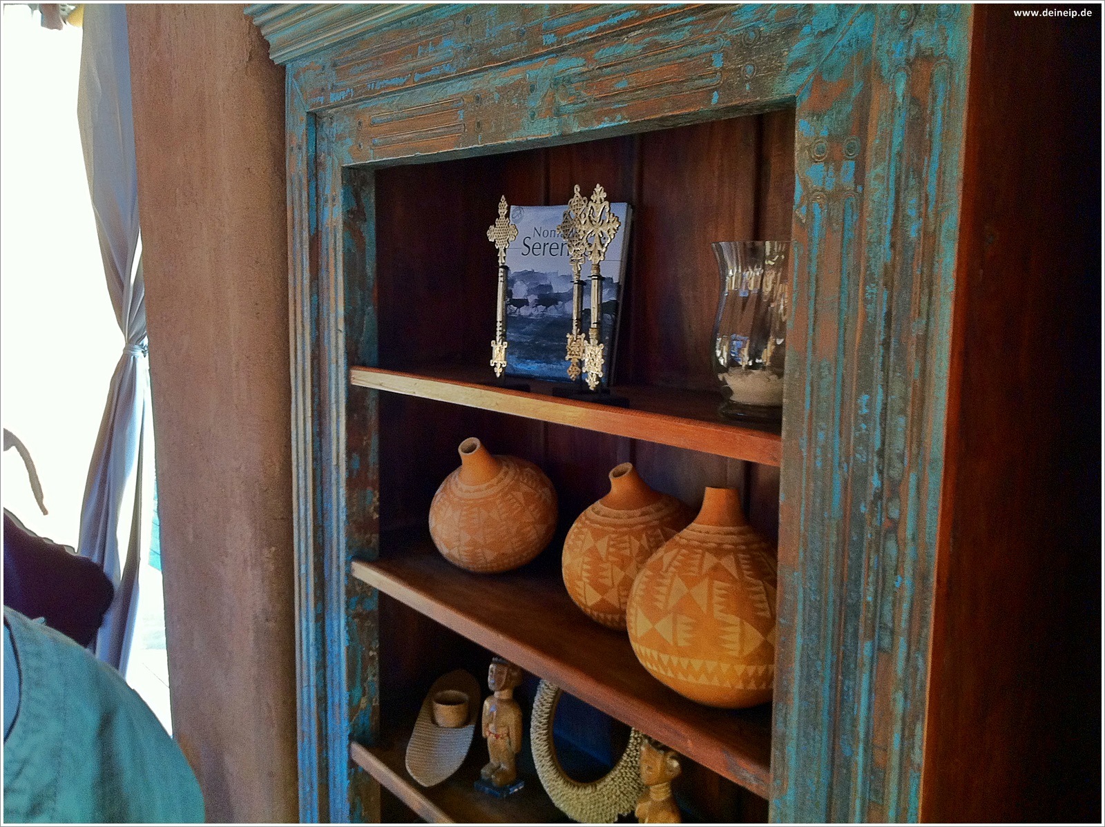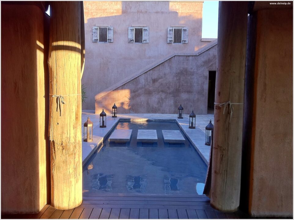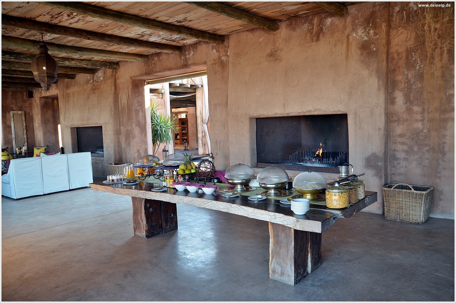 Der Stil ist irgendwie eine Mischung aus marokanischer Wüstenfestung und afrikanischem Buschcamp. Es dominieren grandiose Terrassen mit super Ausblick auf Wasserlöcher zur Wildtierbeobachtung. Die Zimmer mit eigenen Terrassen sind von der Ausstattung für die Region überragend und das Essen lässt auch kaum Wünsche offen. An heißen Tagen laden flache Pools dazu ein, einen Cocktail zu trinken und dabei die Füße im Wasser baumeln zu lassen. Der für Namibia typische Sonnenuntergang ist dabei natürlich inklusive!