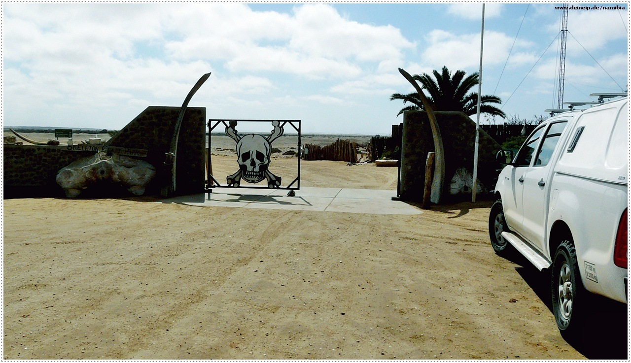 Kommt man aus südlicher Richtung, dann kann man eine kleine “Geisterstadt” neueren Datums besichtigen, die etwa 4 Kilometer vor dem Abzweig nach Cape Cross an der Straße liegt. Vermutlich waren das einmal Wohn- oder Verwaltungsgebäude der nahe liegenden Salzmine. Das ganze Ensemble lässt etwas Wild-West-Feeling aufkommen. Größere Kartenansicht