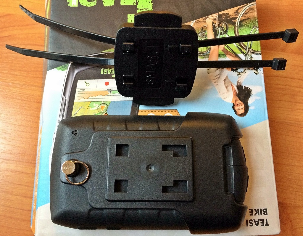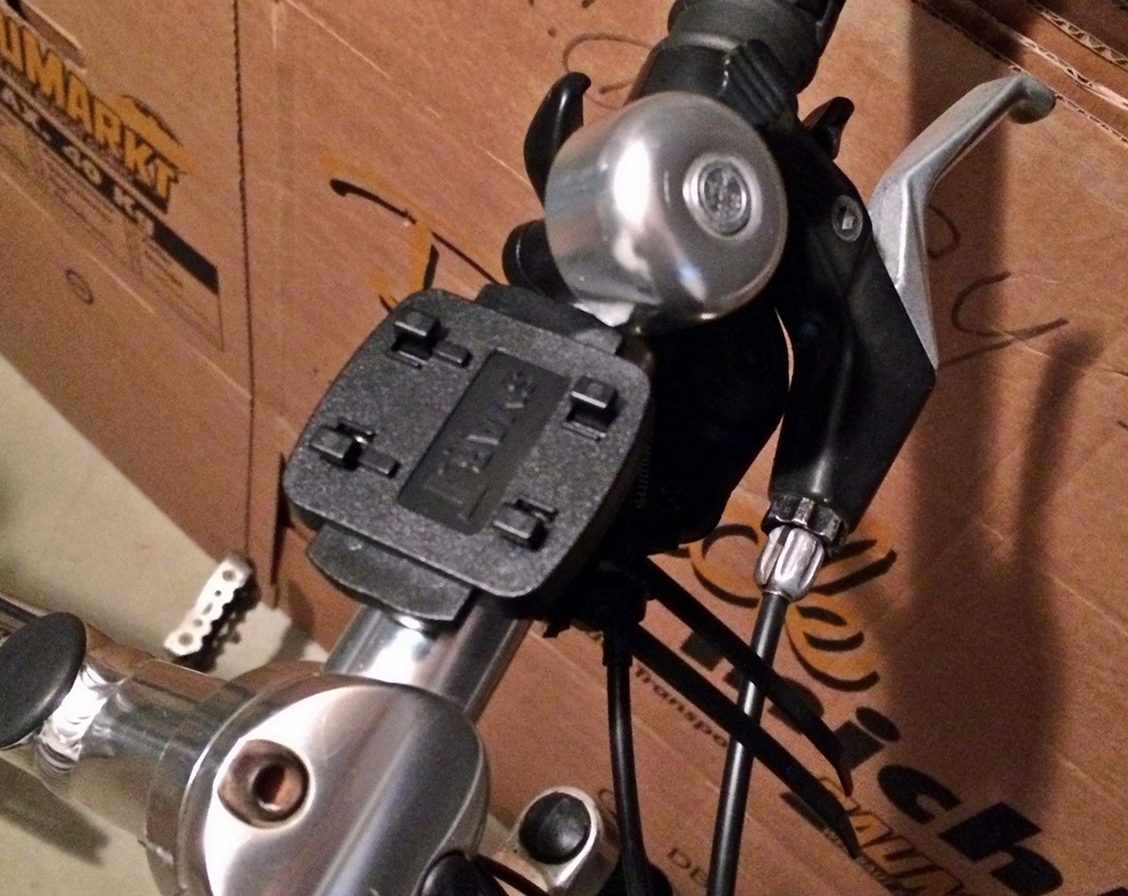 Die Halterung für den Radlenker wird über eine Bodenplatte an der Gerätehalterung angebracht. Hier dachte ich zunächst das Befestigungsmaterial sei nicht im Lieferumfang dabei, doch die Lenkerhalterung wird über zwei “handelsübliche” Kabelbinder, welche durch die Halterung gefädelt werden fixiert. Das klappte nach anfänglicher Skepsis gut und auch bei etwas ruppigerer Fahrweise blieb letztlich alles am Lenker fixiert. Schneidet man die Kabelbinder nach der Montage nicht ab, so sieht das Setup zwar etwas “gebastelt” aus… Auf der anderen Seite kriegt man Ersatzkabelbinder in jedem Baumarkt und es lassen sich alle Lenkertypen und Durchmesser verwenden.