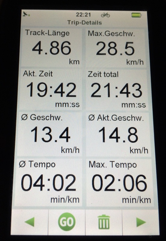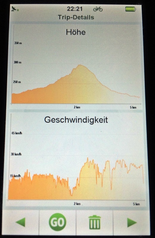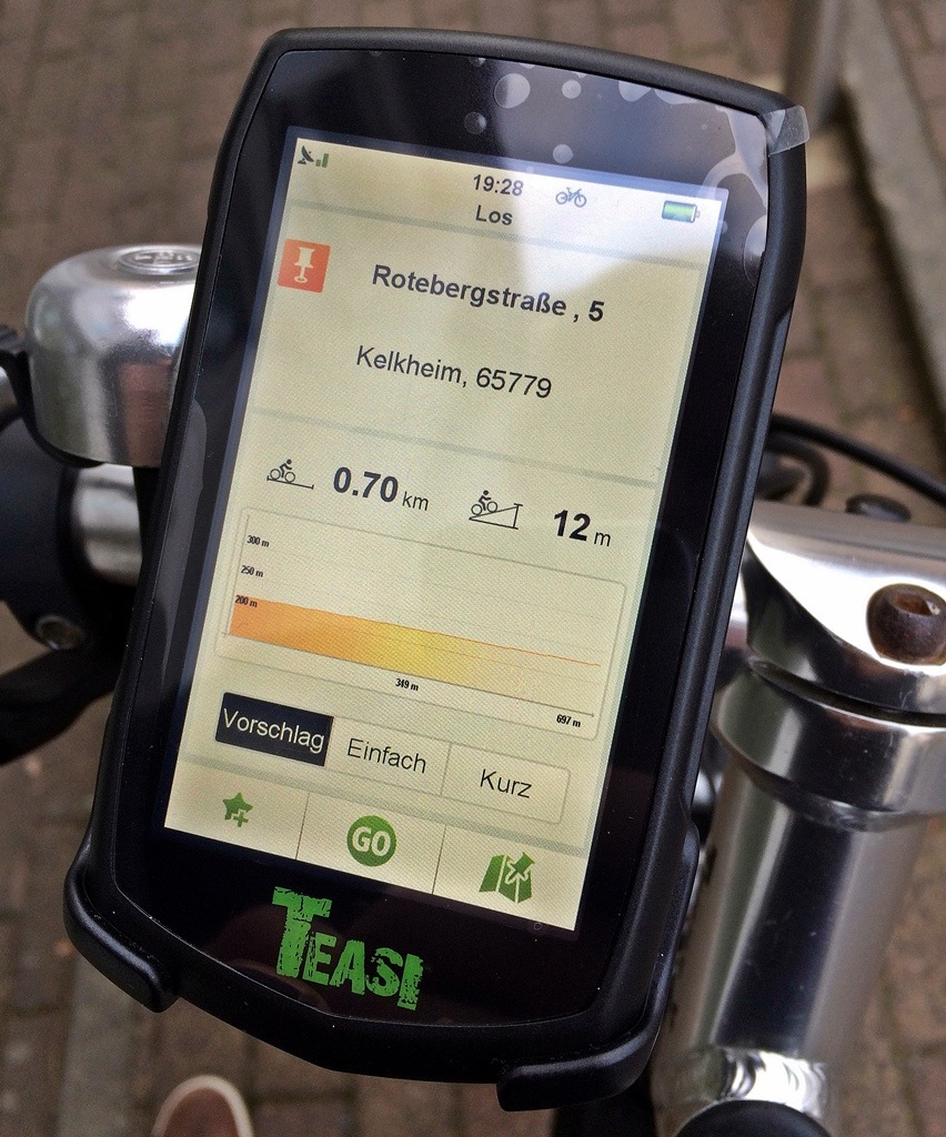 Gibt man eine Adresse ein, dann werden verschiedene Routen angeboten, die Entfernung und Höhenmeter angezeigt. Unterwegs lassen sich die Karte, Entfernung, Geschwindigkeit etc. einblenden. Auch gibt das Teasi einen Piepton von sich, kurz bevor man an einen für die eigene Route relevanten Abzweig kommt. Das ist hilfreich um sich auf das Fahren und die Umgebung zu konzentrieren und nicht dauern auf den Bildschirm schauen zu müssen. Die Lesbarkeit ist Unterwegs gut aber manchmal etwas durch Reflektionen eingeschränkt. Ich habe dann immer etwas den Winkel geändert.