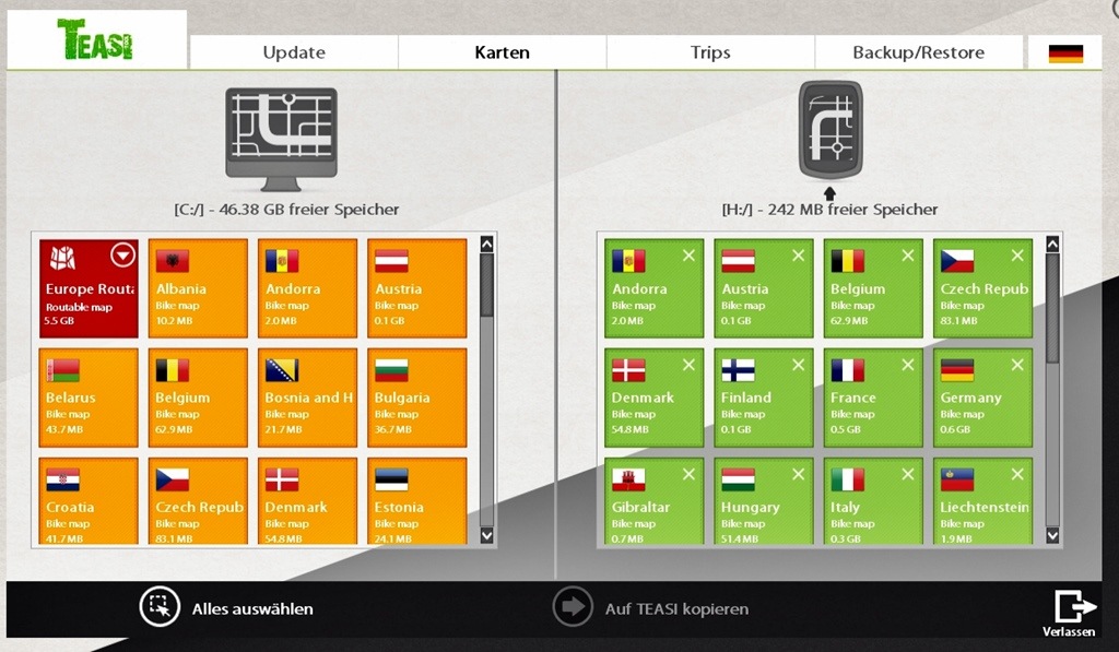Weitere Karten aus Europa können über die Teasi Software kostenlos nachgeladen werden. Kartenupdates und neu hinzukommende Länder sind stets kostenfrei erhältlich, ebenso wie neue Gerätesoftware-Updates.
