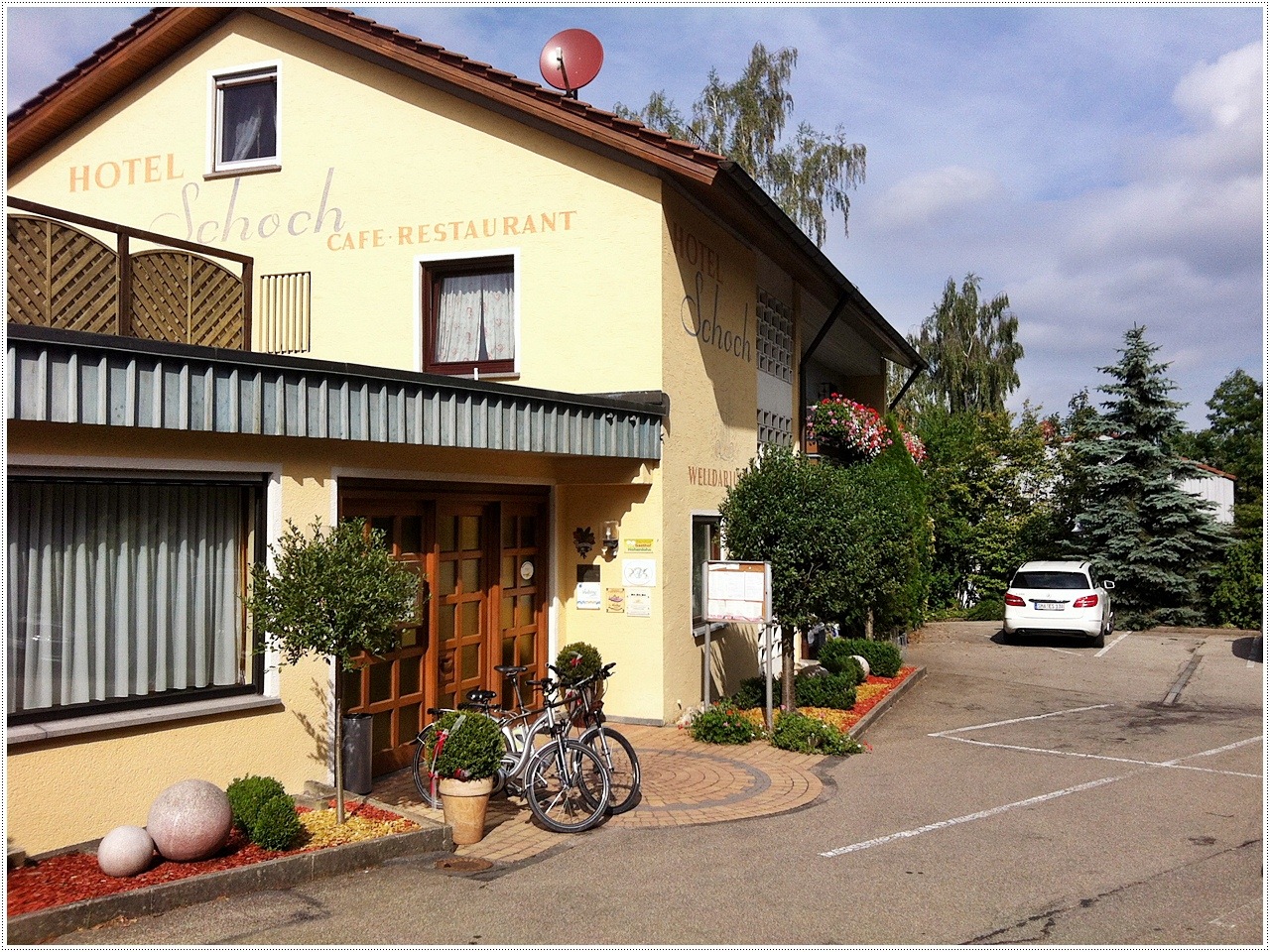 Das rustikale Gasthaus empfing uns sehr freundlich und wir konnten unser Zimmer beziehen. Nach einer Dusche ging es dann ans erneut sehr gute Abendessen: Ein sehr leckerer „Naturpark Teller“ mit Salat, Spätzle und Fleisch (Rind und Schwein). Die Gaststube war an diesem Samstagabend gut gefüllt. Einige Abstriche mussten wir beim Zimmer hinnehmen: getrennte Einzelbetten, sehr einfache Einrichtung, kaputte Badlampe. Nach dem guten Essen und der anstrengenden Radelei konnten wir darüber aber einfach hinwegsehen, auch da das Personal und die Chefin sehr freundlich und herzlich sind.