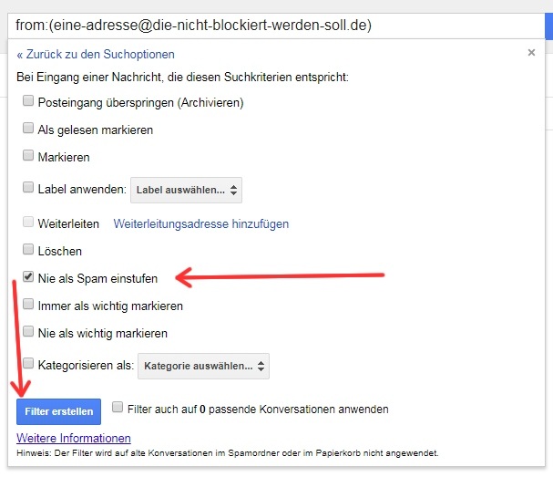 - Nun müsst ihr noch die Option “Nie als Spam einstufen” aktivieren und auf “Filter erstellen” klicken.