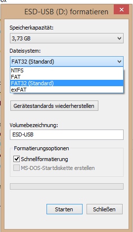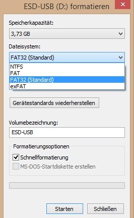- Einen USB-Stick mit dem Dateisystem FAT32 oder exFAT. Das kann ein wenig Tricky sein und klappt nicht mit allen Medien auf anhieb. Hilfe kann euch hier bei widerspenstigen Sticks der Fat32-Fortmatter (Chip-Mirror) geben. Windows erlaubt keine Fat32 Laufwerke über 32 GB zu erstellen.