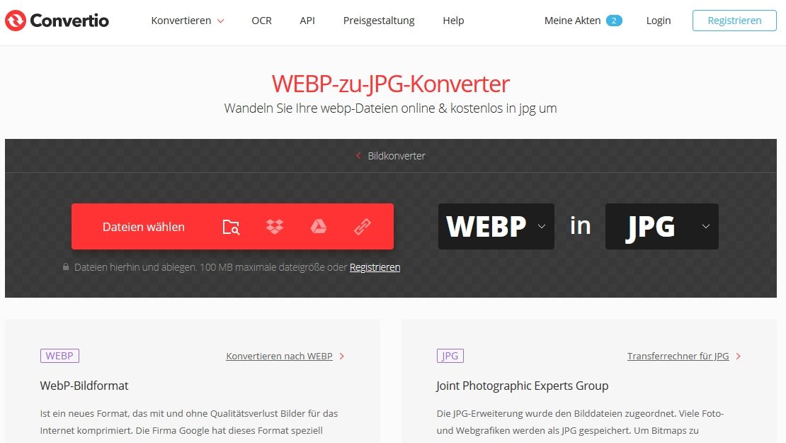 Seit einer Weile stösst man im Internet häufiger auf die neuen WebP Bilder und ist etwas hilflos, denn dieses neue Google eigene Bildformat lässt sich noch nicht in den gängigen Programmen öffnen. Zum Glück gibt es Cloud-Dienste, die eine einfache Umwandlung in JPG oder andere Bildformate ermöglichen. Momentan nutze ich selbst dafür gerne Convertio. Eine einfache Lösung ohne extra eine Software zu installieren und bis Dateigrößen von > 100 MB auch kostenfrei.