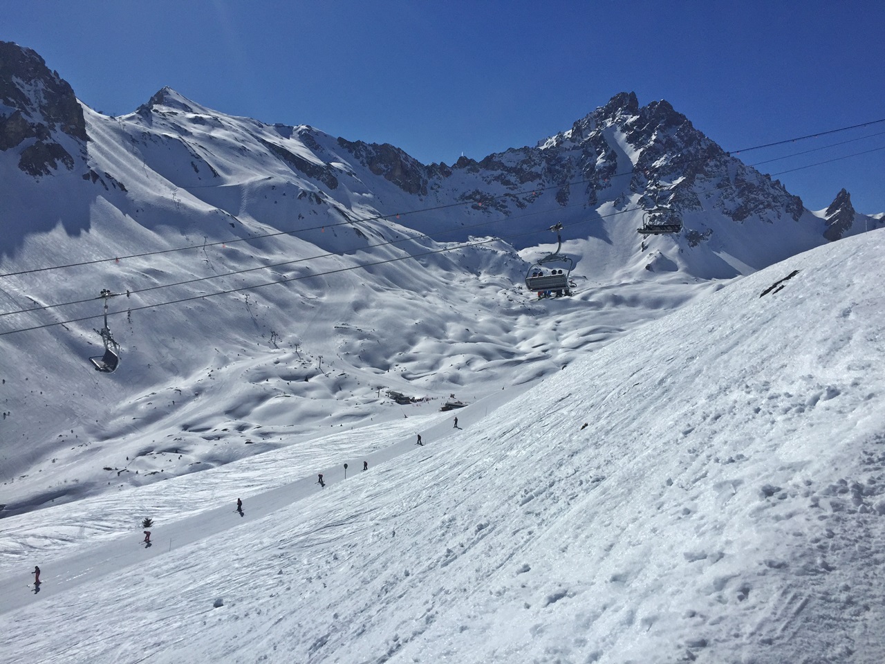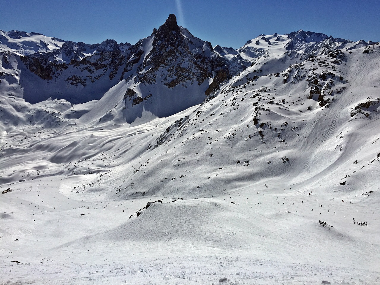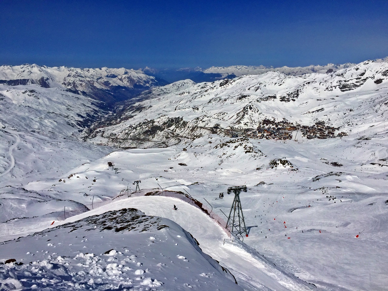 Das Gebiet “Trois Vallees” ist mit über 650 Pistenkilometern, der größte Gebietsverbund in den Alpen. Rechnerisch lassen sich in einer Woche täglich über 100 neue Pistenkilometer erkunden und das will auch erstmal geschafft werden. Die Pistenvielfalt ist gigantisch und man entweder man bleibt in den hochalpinen Bereichen über der Baumgrenze oder man erkundet auch die ewig langen Talabfahrten runter bis auf 800 Meter, egal ob man dabei die umliegenden, tiefergelegenen Ortsteile von Meribel oder Courchevel erkundet oder in den traditionellen Ort Saint Martin de Belleville abfährt. Hier kann man Höhenmeter ohne Ende machen und kann den ganzen Tag im Erkundungsmodus sein.